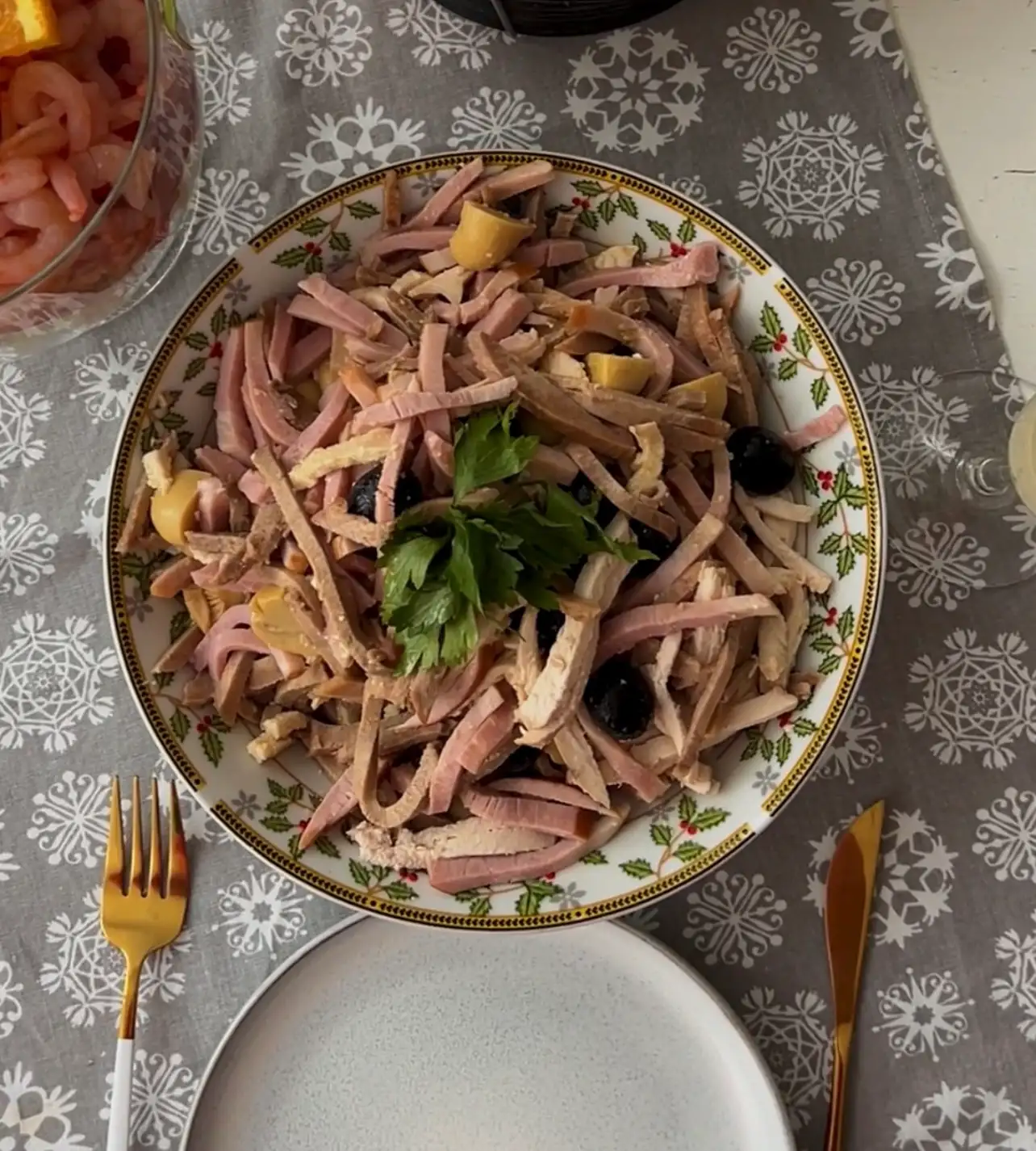 Описание: настоящее мужское блюдо. Несколько видов отварного мяса в сочетании с хрустящим салатом и пикантными огурчиками. Завершает закуску восхитительная заправка — соус на основе дижонской горчицы, лимонного сока, насыщенного бульона (да-да, моя фишка) и оливкового масла. Заправка упакована отдельно. Заказать можно любым весом, количество указывайте в комментарии к заказу. Состав: язык говяжий, ветчина, куриное филе, шампиньоны, маслины, маринованные огурчики, маринованный лук. Заправка (отдельно): оливковое масло, горчица, мёд, соевый соус, уксус.