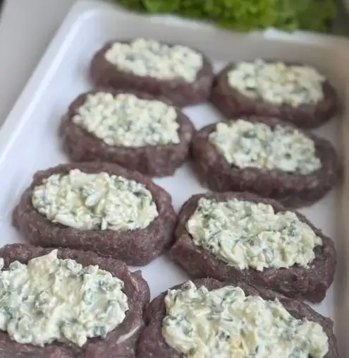 Состав: фарш свинина-говядина, специи, лук свежий Начинка: яйцо, лук зеленый, сыр творожный, майонез