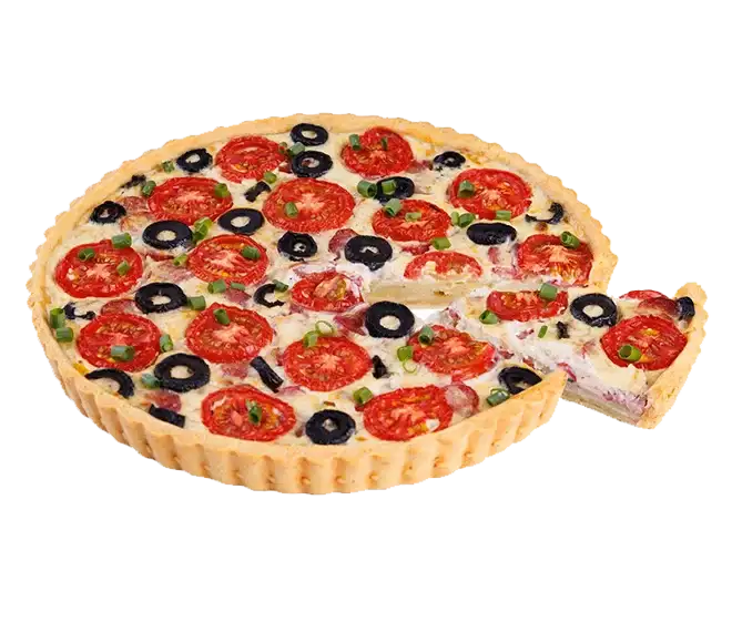 С колбасками, зеленым лучком, оливками и картофелем Любимый пирог самых весёлых и самых голодных компаний. Состав: начинка (картофель, колбаски охотничьи, маслины, томаты), тесто (масло сливочное, мука пшеничная, яйцо куриное, сахар белый, соль, уксус, гидрокарбонад натрия Е500ii (сода пищевая)), соус (сливки животные, яйцо куриное, сыр), лук зеленый. Срок годности: 48 ч при температуре 4±2°C. Пищевая ценность продукта на 100 г: Калорийность — 220 ккал Белки — 7,0 г Жиры — 12,0 г Углеводы — 20,0 г Рекомендуем резать на кусочки: по весу 500 г на 4 кусочка по весу 850 г на 8 кусочка Уточнения: Вес 500 г — Ø пирога ≈ 18 сантиметров Вес 850 г — Ø пирога ≈ 24 сантиметров Внешний вид изделий может отличаться от фотографий, так как каждый пирог — это ручная работа