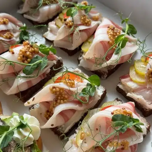 Маринованный огурчик, грудинка соленная, французская горчица, перчик сладкий