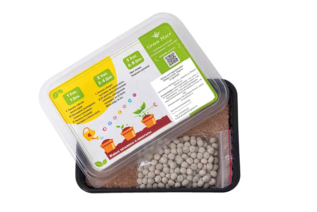 В набор «1 урожай» входит: — инструкция по посадке — контейнер 500 мл с крышкой — льняной коврик — семена микрозелени