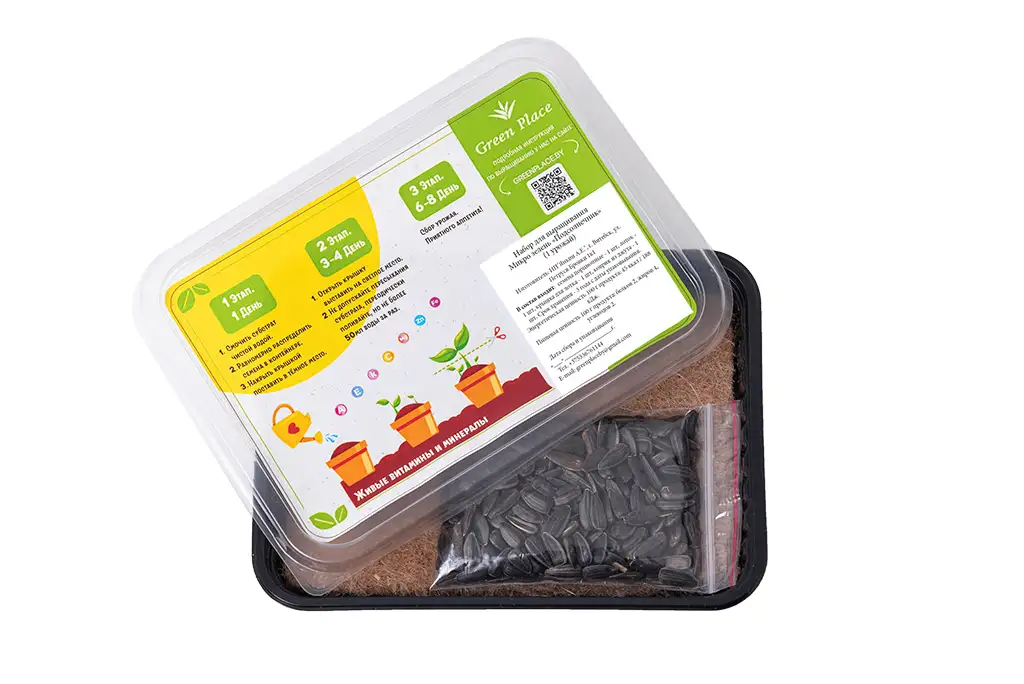 В набор «1 урожай» входит: — инструкция по посадке — контейнер 500 мл с крышкой — льняной коврик — семена микрозелени