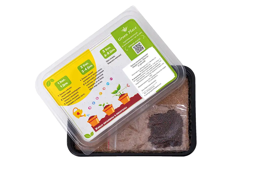 В набор «1 урожай» входит: — инструкция по посадке — контейнер 500 мл с крышкой — льняной коврик — семена микрозелени