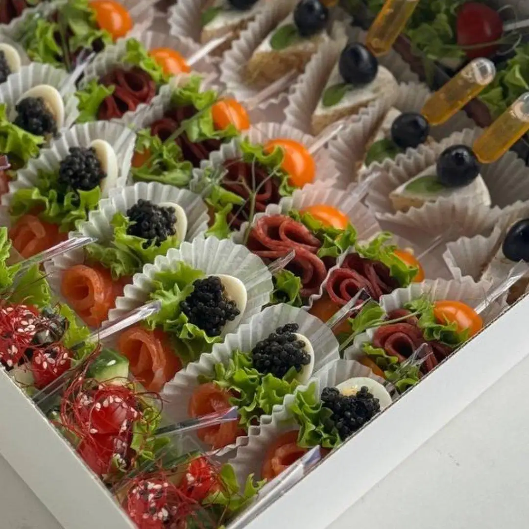 36 штук. 1. Капрезе с бальзамическим кремом 6 шт. 2. С камамбером и мёдом 8 шт. 3. С колбасой и черри 8 шт. 4. С лососем и перепелиным яйцом 8 шт. 5. Овощи с кисло-сладким соусом 6 шт.