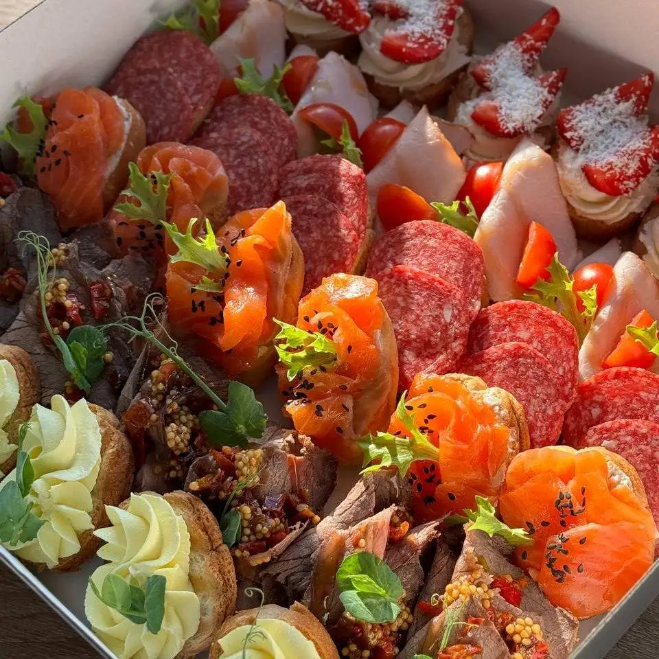 По 6 штук каждого вида: — с яично-сырным паштетом — с карбонадом — с лососем — с говядиной — с ягодами — с салями