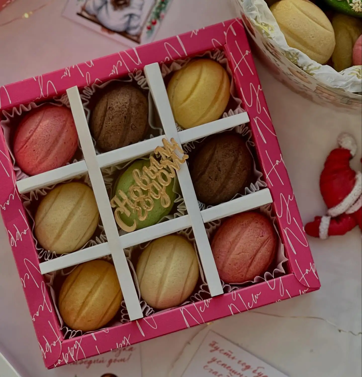 В каждом наборе есть начинки: * Ванильные сливки; * Вишнёвочка; * Фисташка-малина; * Лимон-мак; * Капучино.