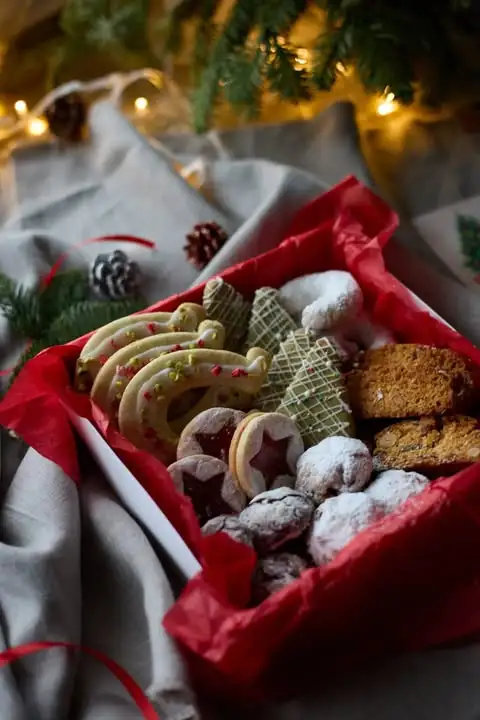 По вкусам: — Бискотти (кантуччи) с миндалем и клюквой — Шоколадное с трещинками (очень вкусное, в составе миндальная мука) — Линцерское печенье с клубничным джемом — Штолленки — Ванильные рогалики (Vanillekipferl) — Лимонное печенье в виде подковы с сублимированной клубникой и дробленой фисташкой — Елочки с зеленой матчей