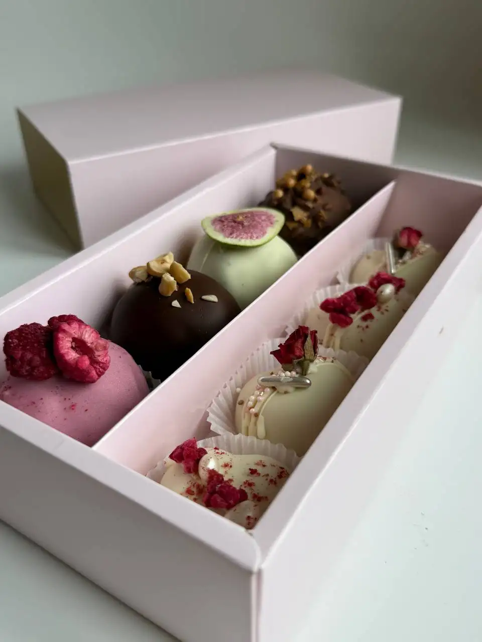Акция: до конца ноября 2025 г. скидка на пирожные 10% (65 руб. вместо 72 руб.) -- Состав набора -- Ассорти картошки с начинками (4 шт.): 🔸Красный бархат/малина 🔸Морковная/лимон 🔸Шоколад/ферреро 🔸Шоколад/сникерс Муссовые сердечки черная смородина (нежнейшее лакомство в белом шоколаде), 4 шт.