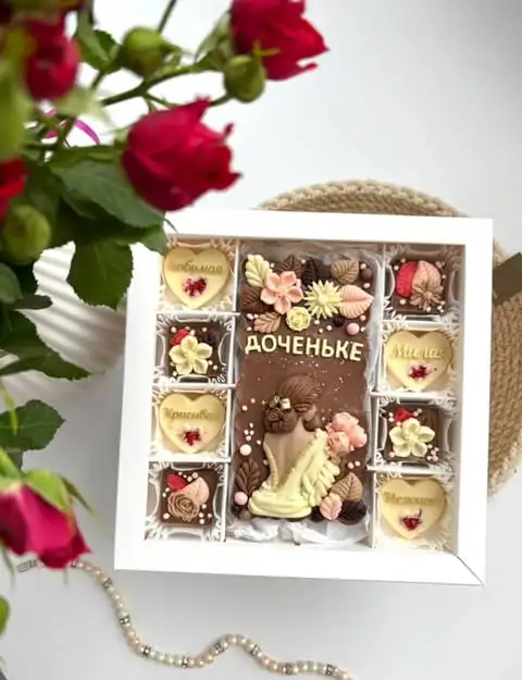 Набор шоколадных фигурок ручной работы "Для любимой дочки". В составе качественный бельгийский шоколад нежных оттенков. Это отличный и вкусный подарок на День рождения для дочери, наполненный заботой и сладкой радостью. Размер коробки: 20х20 см.