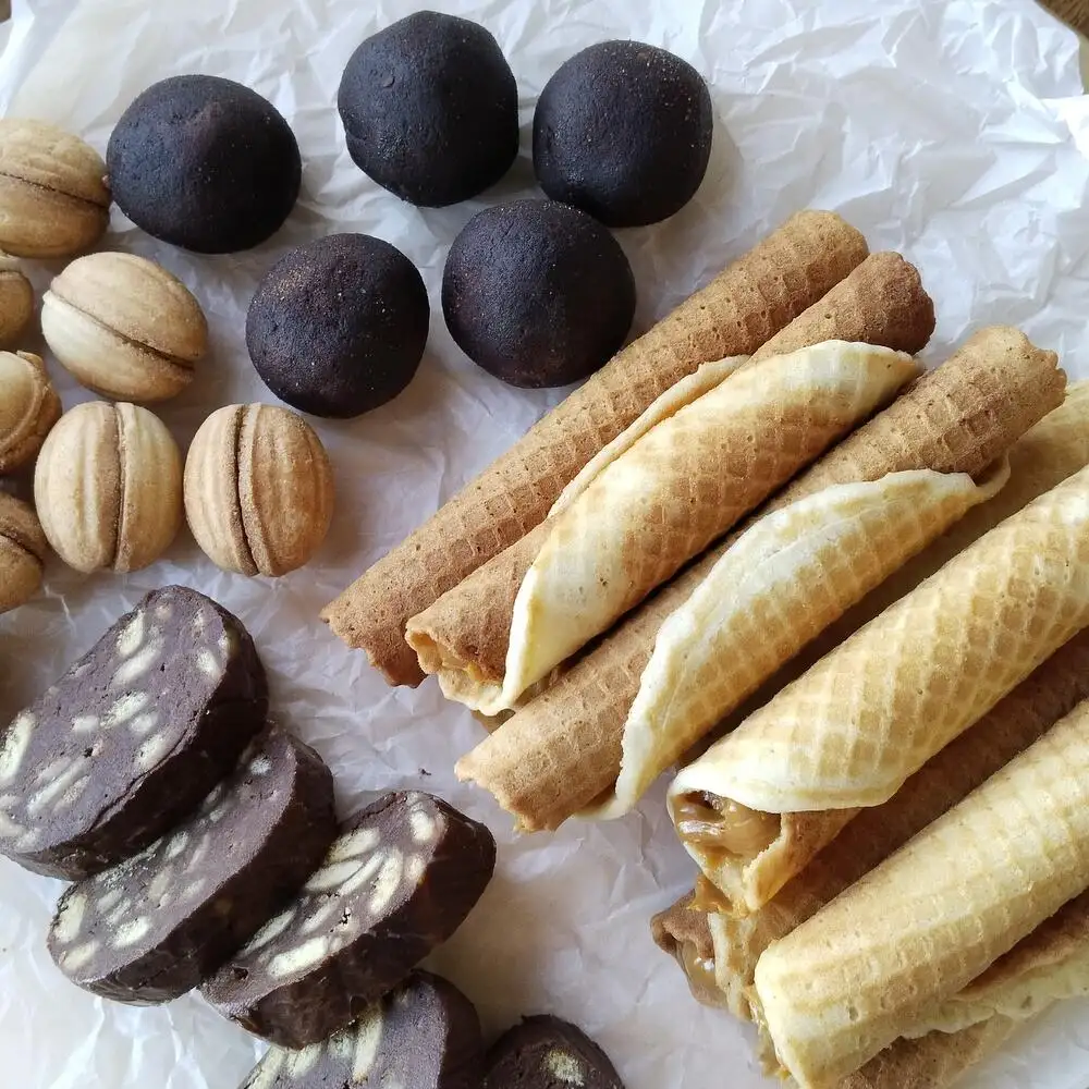 Набор Ретро сладостей со вкусом детства отличный вариант побаловать себя, подарить другу или угостить коллег. Вес набора зависит от выбранного наполнения. На выбор: — 4 орешка, 2 трубочки, 1 колбаса — 5 орешков, 2 трубочки, 2 колбасы — 4 орешка, 3 трубочки, 1 картошка — 8 орешков, 2 трубочки