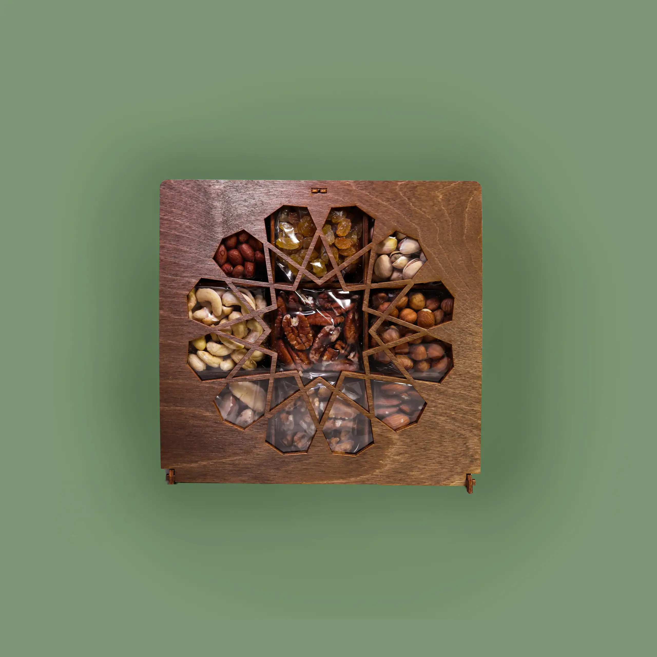 Состав: Миндаль очищенный сырой (Турция) — 70 гр. Грецкий орех очищенный (Китай) — 60 гр. Бразильский орех (Россия) — 60 гр. Фундук очищенный сырой (Азербайджан) — 60 гр. Пекан сушеный (Перу)— 70 гр. Орех кешью сырой 320 (Вьетнам) — 70 гр. Фисташка жареная соленая (Россия) — 80 гр. Виноград сушеный изюм (Иран) — 80 гр. Арахис сырой (Индия) — 70 гр. Коробка деревянная (Республика Беларусь) на 9 ячеек Состав набора можно подобрать на свое усмотрение! В подарок к каждому набору идет открытка. Масса нетто: 620 гр.