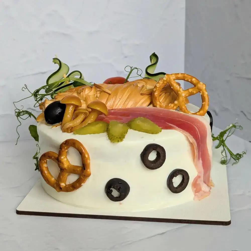 Состав Яйцо, мука, молоко, растительное масло,разрыхлитель, соль, сахар, специи, сыр, творожный сыр, сливки, лук, черри, маринованные огурцы, бекон, мясная нарезка, микрозелень, сыр копчёный Размер Ширина — 12 см Высота — 9 см Что внутри этого монстра? Сырный бисквит — основа, которая не боится экспериментов. Три вида соусов — чтоб жизнь была в наслаждение и со вкусом Говяжья котлета — потому что мясо решает 🥩 Маринованный лучок и огурчики — добавляют характер и пикантность Творожный сыр — обволакивает все это великолепие А теперь самое брутальное — копчёный сыр косичкой или чечил — для истинного аромата Томаты черри — чтобы не было слишком серьезно Микрозелень — помним о пользе Бекон и мясная нарезка — потому что мы не боится быть собой