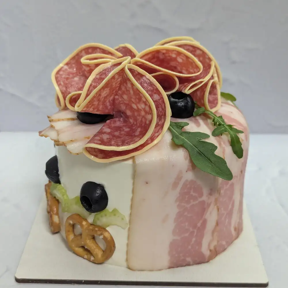 Состав Яйцо, мука, молоко, растительное масло,разрыхлитель, соль, сахар, специи, сыр, творожный сыр, сливки, лук, черри, маринованные огурцы, бекон, мясная нарезка, микрозелень,оливки, сельдерей, крекер соленый Размер Ширина — 12 см Высота — 10 см Несладкий бенто торт с сырным бисквитом, соусами, чери, огурчиками, маринованным лучком, говяжьей котлетой, крем-чизом и аппетитным съедобным декором (беконом).