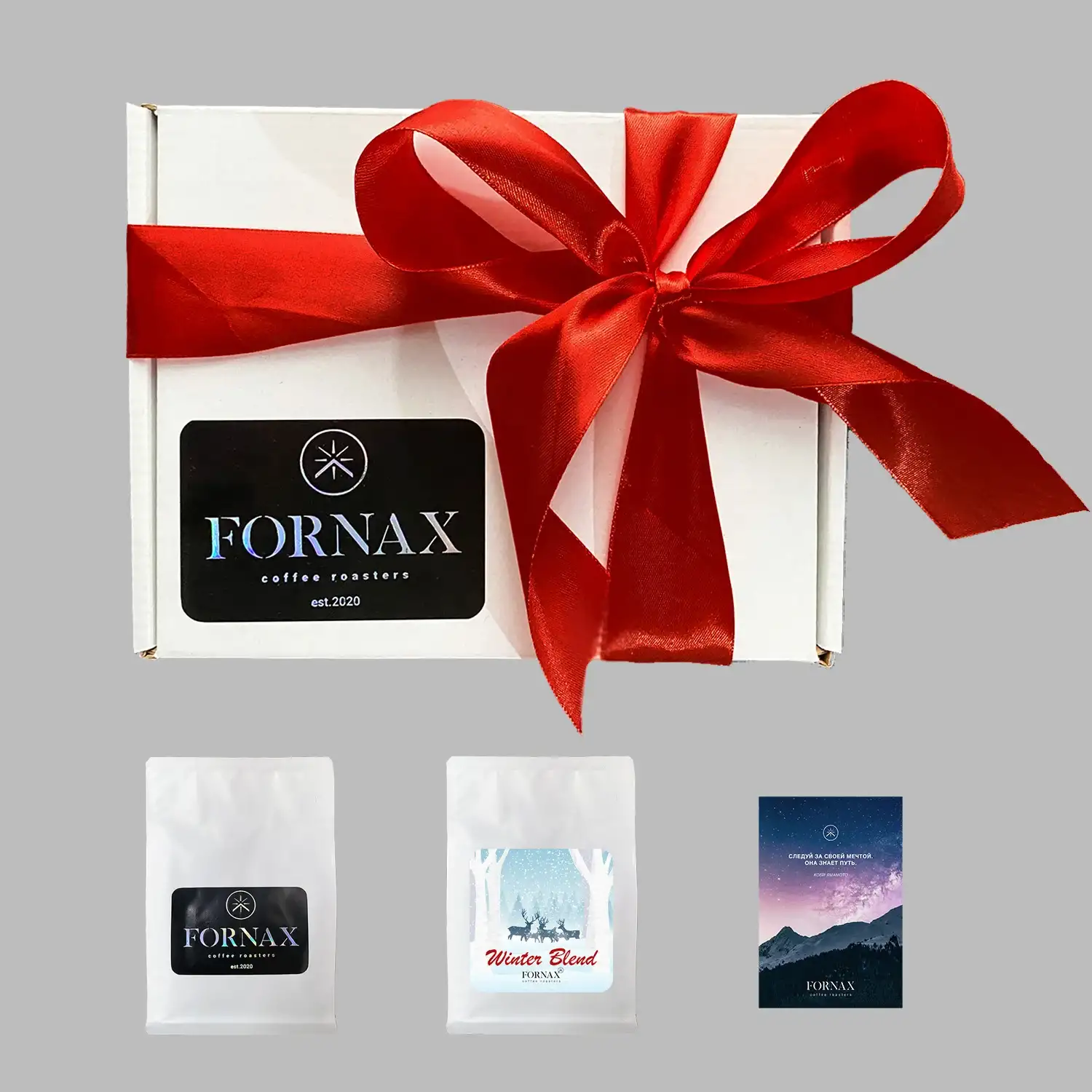 Набор состоит из: — 250 г лимитированного авторского бленда Winter Blend — смесь арабик с добавлением ферментированного на вине кофе обладает ярким удивляющим новогодним вкусом. — 250 г Бразильской арабики — классика с нотками орехов и шоколада, которая нравится всем. Набор оформлен в фирменную коробку с галаграфическим логотипом и перевязан лентой. Приятным дополнением станет фирменная открытка, которую Вы сможете дополнить поздравлением или оставить как есть. Есть возможность приобретения молотого кофе для турки, чашки, кофеварки, френч-пресса и др.