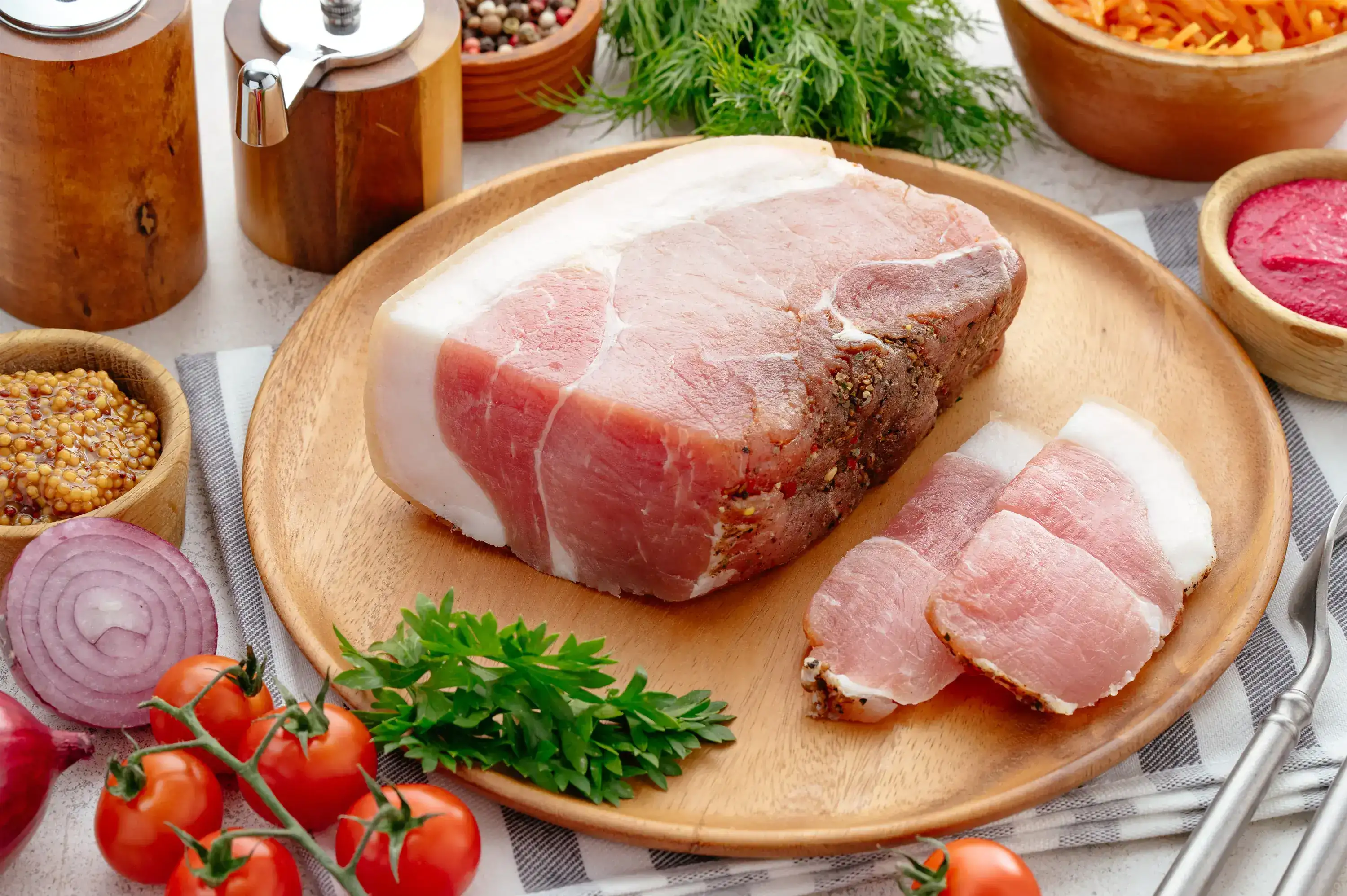 Состав: тазобедренная часть свиная, соль поваренная пищевая йодированная, комплексная пищевая добавка (соль поваренная пищевая (содержит агент антислеживающий Е536), фиксатор окраски Е250, йодат калия), пряности натуральные (перец красный сладкий, перец черный, тмин, кориандр, перец душистый, чеснок сушеный, кардамон, мускатный орех, лавровый лист). Характеристики: Жиры — 29 г Белки — 16 г Углеводы — 0,3 г Срок годности — 60 суток Энергетическая ценность (калорийность) — 1380,0 кДж/330,0 ккал