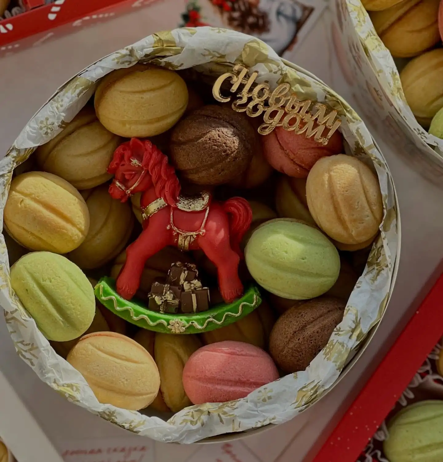 круглая коробка 16 см 12 шт. классических орешков с домашней варёной сгущёнкой + 10 шт. с разными начинками + шоколадная фигурка из бельгийского молочного шоколада