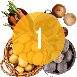 Малый овощной набор состоящий и мешка картошки — 40 кг, сетки лука — 5 кг, сетки моркови — 5 кг, сетки свёклы — 5 кг.