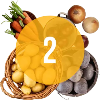Средний овощной набор состоящий из двух мешков картошки по 40 кг каждый, сетки лука — 10 кг, сетки моркови — 10 кг, сетки свёклы — 10 кг.