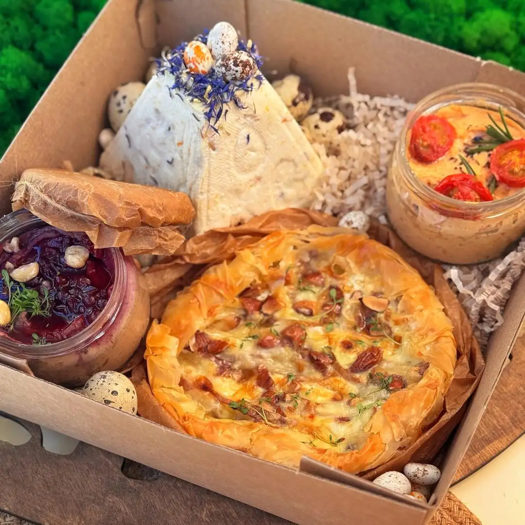 Творожная пасха Вареные перепелиные яйца, шоколадные перепелиные яйца 2 вида домашних паштетов ( пате из индейки с овощами и яблоком, паштет из куриной печени в брусничной заливке) Пирог с сыром Камамбер, грушей, медом и орешками Бокс 25×25 см