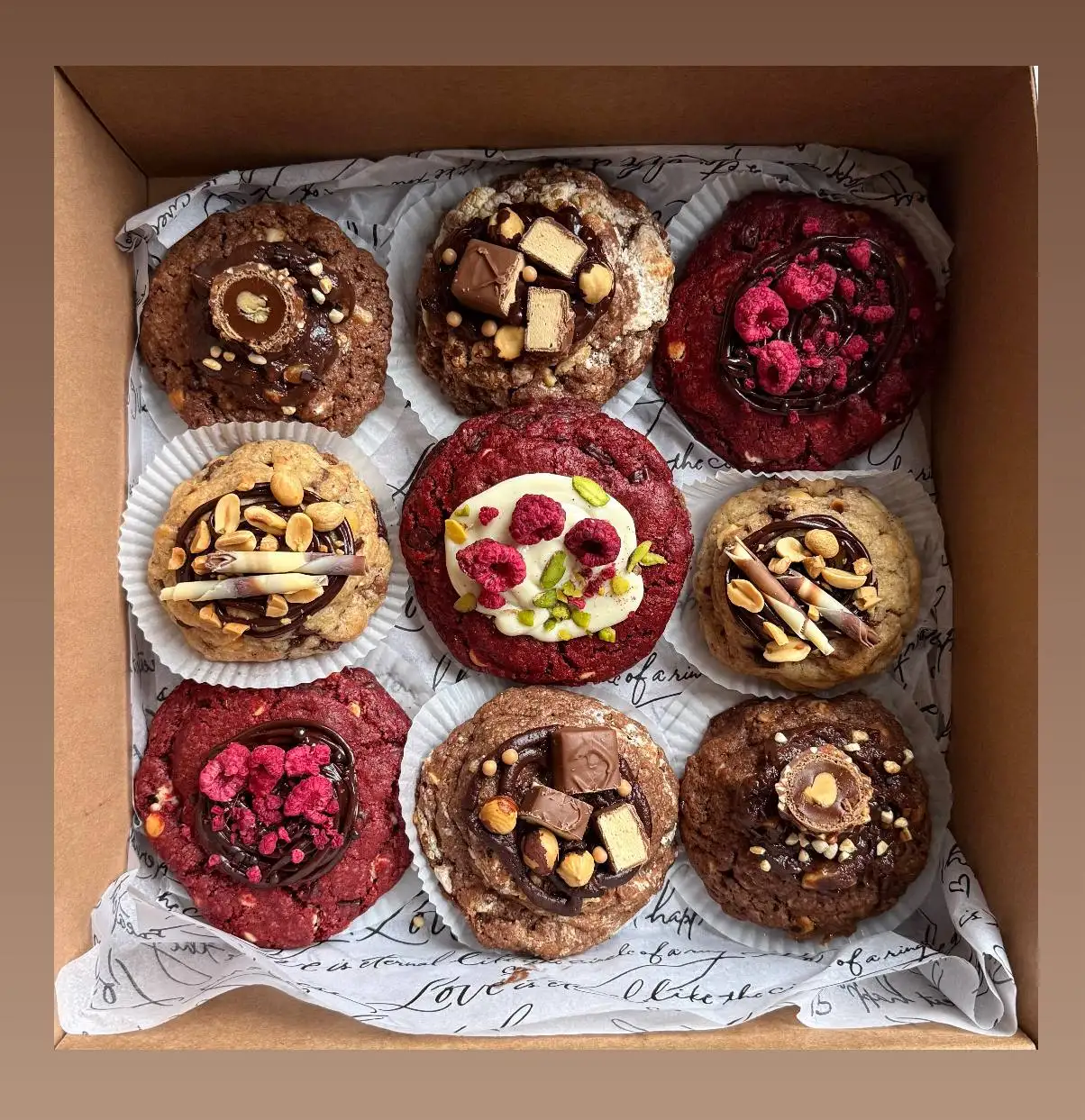 Ароматные печенья с богатым внутренним миром, тесто с добавлением орехов и шоколада, а также начинка чизкейк/ягодная/нутелла -- Варианты вкусов -- - Красный бархат/чизкейк/малина - Красный бархат/нутелла - Шоколад/милкивей - Шоколад/нутелла - Шоколад/ферреро - Классика/арахисовый чизкейк - Классика/нутелла -- Вес -- Весь одного печенья: 130 гр. -- Стоимость -- Возможно заказать набор из 2-3-4 и более печений: 2 шт - 25р 3 шт - 40 р 4 шт - 50 р 6 шт - 75 р 9 шт - 115 р