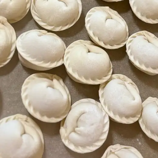 Состав: мука пшеничная, вода, масло растительное, яйца, соль. Начинка: домашний фарш (свинина), лук репчатый, соль, специи