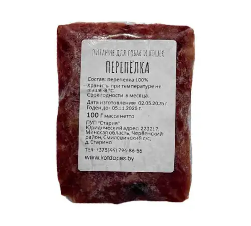 Мелко прокрученный фарш. Тушка перепелки 100%. Вакуумная упаковка. Мясо перепелов — ценный источник животного белка, считается диетическим продуктом, так как является менее жирным и крайне редко вызывает аллергию. В перепелке в большом количестве присутствует калий, полезный для мозга и сердца питомца, фосфор, улучшающий обмен веществ, а так же витамин А, группа витамина В и важный для профилактики рахита витамин Д. Подходит для собак мелких пород (весом до 3-4 кг), всех пород кошек. Рекомендуется давать с 3 месячного возраста, когда питомец уже переведен на сырые натуральные корма. Исключительно натуральный продукт (мясо, субпродукты, костная составляющая перепелки). Рекомендуется давать в сыром виде, можно употреблять в пищу питомцу сразу после разморозки.