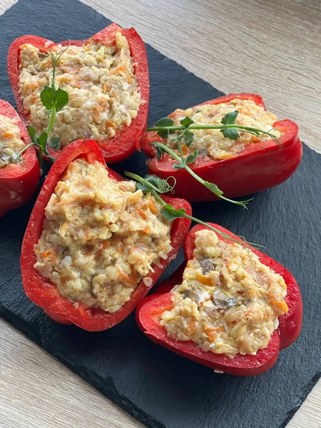 *перец болгарский *булугур *фарш (на выбор) *сливки *чеснок сушеный *морковь *лук репчатый *шампиньоны *сыр твердый *перец черный молотый *соль *масло подсолнечное Продукт (по желанию) может быть как в замороженном, так и в готовом виде