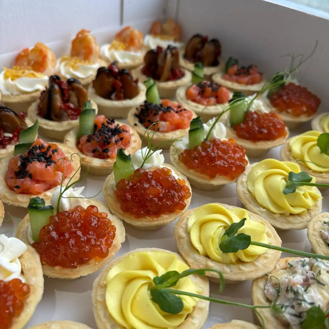 С форелью — 6 шт С карбонатом, с сыром и зеленью — 6 шт С сырно-яичным муссом — 6 шт С икрой — 6 шт С мидиями и вялеными томатоми — 6 шт С креветкой — 6 шт