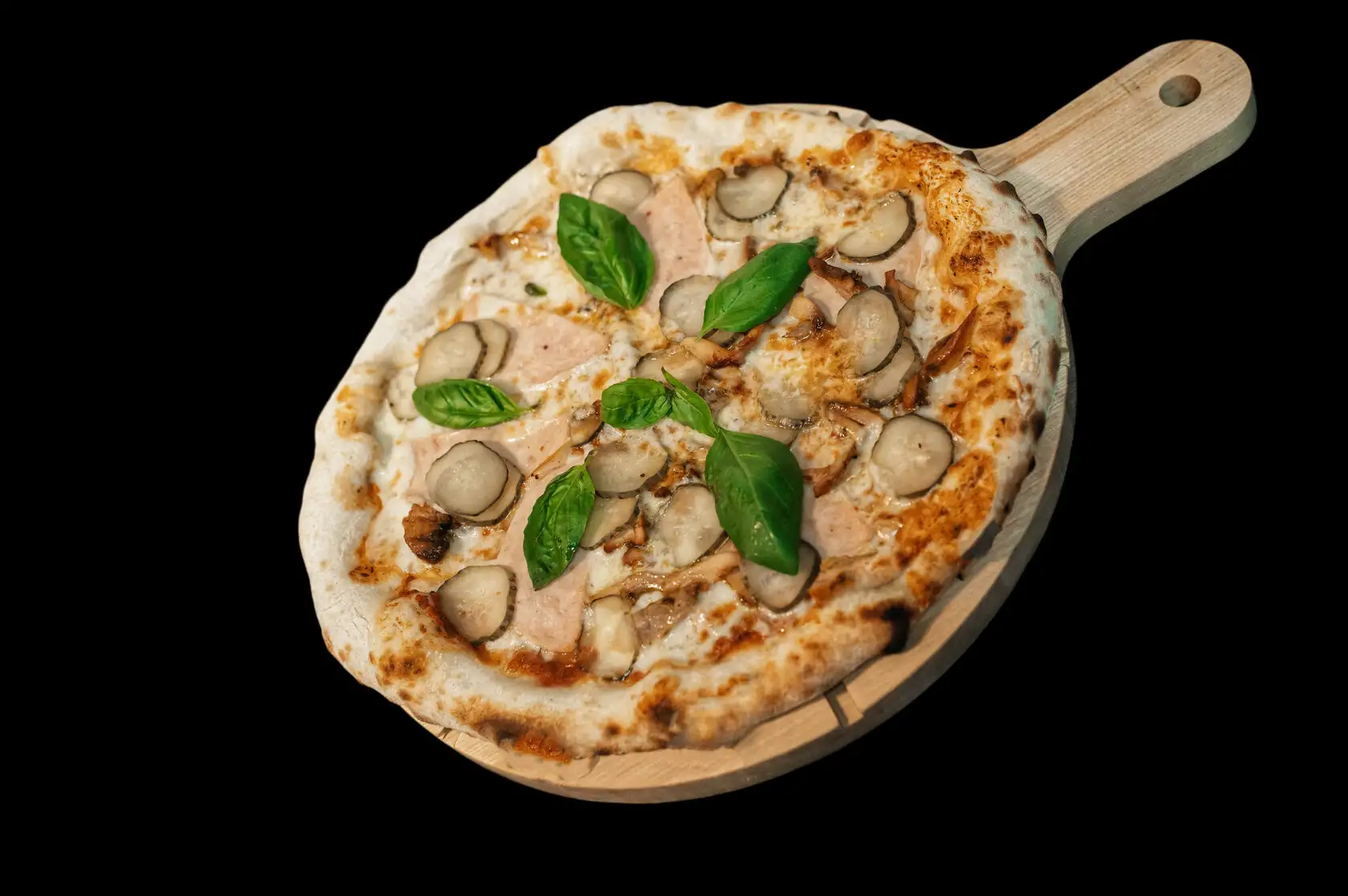 500-550 гр Томатный соус, сыр моцарелла, ветчина, шашлык куриное бедро, корнишон