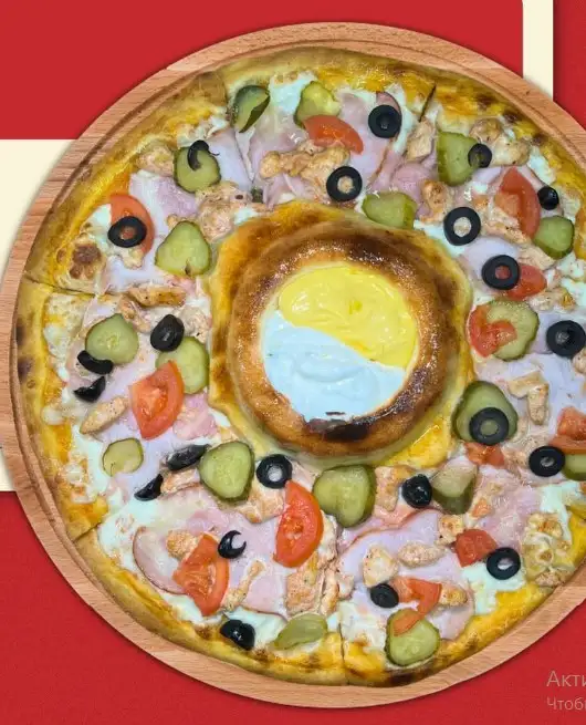 Соус пицца, полендвица в/к, грудинка в/к, курица, томат, маслины, огурец марин., соус чесночный и сырный