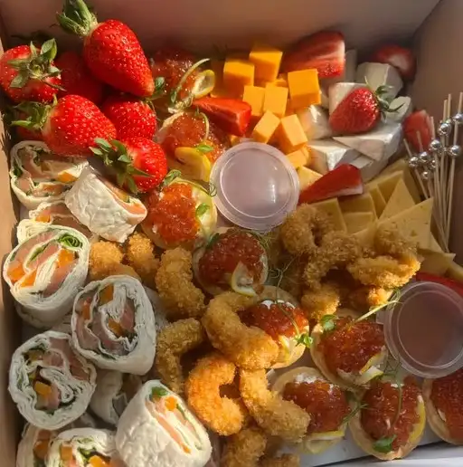 Сыр Бри, сыр Чеддер, сыр Классический (твердый), тарталетки с творожным сыром и икрой (8 штук), рулет из лаваша с форелью (13-14 штук), креветки во фритюре жареные (12 штук), ягоды или фрукты, соус кисло-сладкий, мед