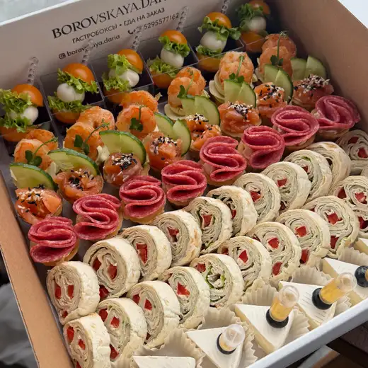 1. Канапе капрезе 6 шт 2. Кростини с креветкой и песто 6 шт 3. Мини-тарталетка с рыбой 8 шт 4. Мини-тарталетка с салями 8 шт 5. Лаваш с ветчиной и перцем 6. Сыр бри с медом и сезонной ягодой