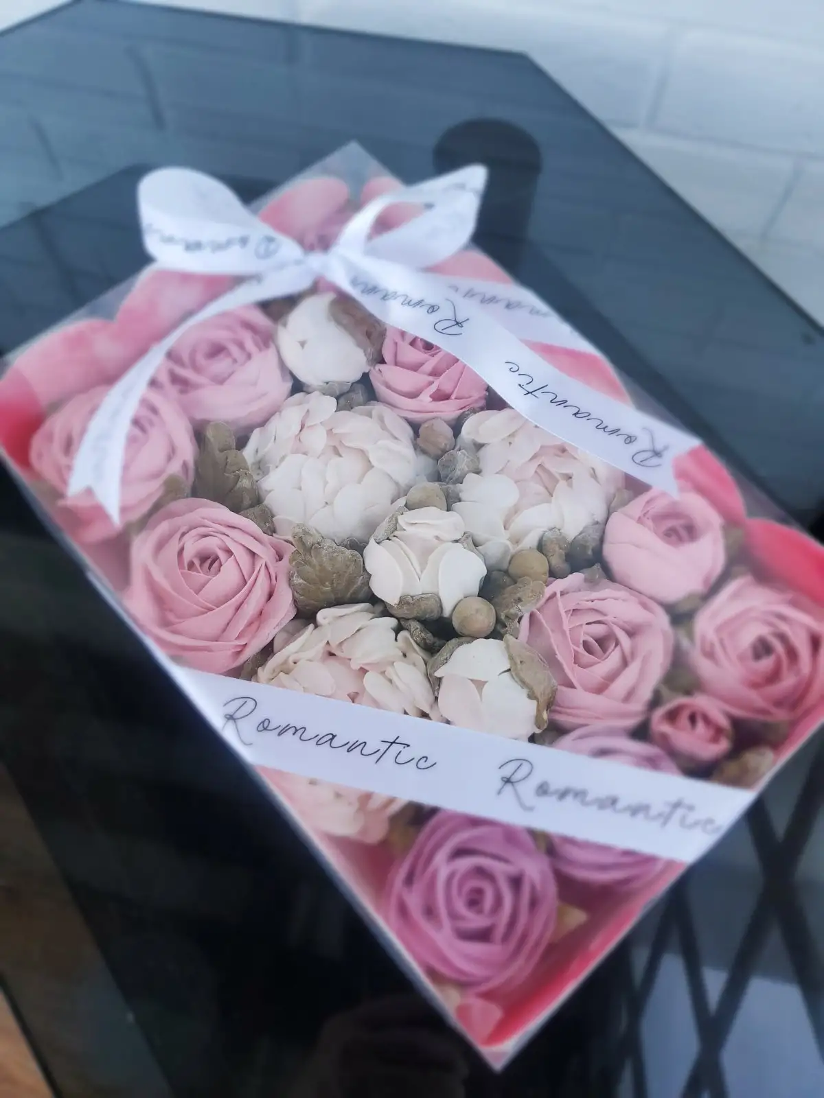 Размер коробки: 20×30×7 см. Состав: яблочное и (или) ягодное пюре, сахар, яичный белок или альбумин, агар. Для изготовления цветов как правило используется яблочное пюре, т. к. нужен белый цвет. Цветы обсуждаются при заказе из того, что видит на фото. Срок изготовления: 3 дня Срок годности: храниться зефир 10–14 суток герметично упакованным при температуре 18±3 °C и относительной влажности не более 75%. Доставка осуществляется «Евопочтой» за счёт заказчика по всей Беларуси. Имеется сертификат соответствия нормам ЕС.