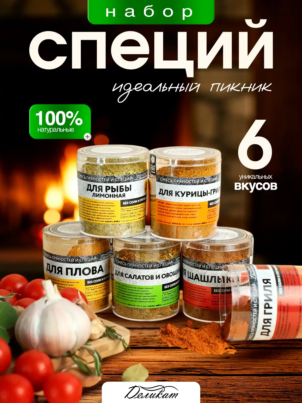 масса нетто: 360 г Для Гриля — 60 г Для Рыбы лимонная — 60 г Для Салатов и овощей — 60 г Для Курицы-гриль — 60 г Для Плова — 60 г Для Шашлыка — 60 г
