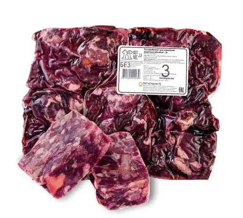 Состав: Крупнокусковой фарш. Говядина. лёгкое, мясная обрезь, почки, печень, рубец очищенный. Порезан на кусочки. Вакуумная упаковка. Лёгкое полезно тем что в его состав входит немалое количество витаминов, в частности, А группы В, РР и даже С. Помимо этого, есть в нем и необходимые макро и микроэлементы — калий, кальций, фосфор, натрий, магний, а также селен, марганец, медь, цинк и железо Мясная обрезь богата легкоусвояемыми белками, микроэлементами, аминокислотами и витаминами, в том числе, группы В, нормализующей работу сердечно-сосудистой и кровеносной систем. Рубец имеет хорошую питательную ценность. Его состав обогащен: железом, фосфором, кальцием, йодом, калием, серой, аскорбиновой и никотиновой кислотой витамином B6, B12, D и E. Благодаря этому субпродукту можно укрепить мышцы и кости, а также улучшить пищеварение и оздоровить микрофлору кишечника без обращения к препаратам из ветаптеки. Такое блюдо особо полезно для организма подрастающих щенков. Говяжья печень — полезный и легкоусвояемый продукт. Даже в маленьком куске содержит большое количество витамина A, C, K, PP, E, D, много железа, фтора, калия, магния и меди. Также, данный субпродукт славится высоким содержанием аминокислот (лизин, метионин, триптофан, тиамин) и другими полезными микроэлементами. Однако, стоит помнить, что как и любой продукт, печенка имеет ряд противопоказаний. С осторожностью ее нужно давать пожилым собакам, поскольку экстрактивные вещества могут оказать негативное воздействие. Для них приемлема доза не больше 50-80 гр. (в зависимости от размера особи) не чаще 2 раз в неделю. Почки в рационе собак и кошек являются ценным диетическим компонентом, источником полноценного животного белка. Это лучший вариант из всех субпродуктов, которые могут быть добавлены в корма. В них входят незаменимые для плотоядных витамины группы В и основные минералы: магний, калий, сера, натрий и прочие. Рекомендации: Подходит для всех пород собак и кошек. Рекомендуется давать с 5 месячного возраста. Исключительно натуральный продукт (мясо +субпродукты) Не рекомендуется давать животным с чувствительным пищеварением. Рекомендуется давать в сыром виде, можно употреблять в пищу питомцу сразу после разморозки. Можно комбинировать с овощами и фруктами. Срок хранения Хранить при температуре не выше −8 °C. Срок годности 6 месяцев.