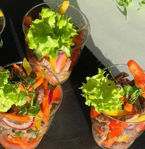 На выбор: Салат с говядиной и овощами Салат с копчёной курицей и шпинатом Салат с креветками и копчёным беконом Салат «Греческий» Минимальный заказ от 5 штук.