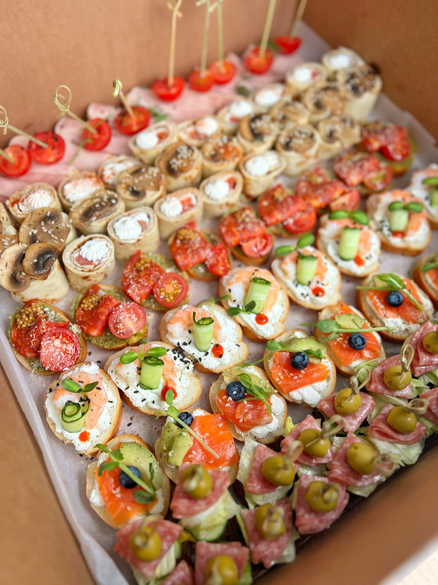 Брускетта с креветкой — 8 шт Брускетта с форелью — 8 шт Брускетта с чоризо и черри - 9 шт Канапе на черном хлебушке с салями и оливкой — 16 шт Блинчик с форелью — 12 шт Блинчик с шампиньонами — 12 шт Мясной рулетик с сырной начинкой и черри — 10 шт Итого: 75 видов закуски в фудбоксе. Рассчитан на 10-15 человек. Вес: 2 кг