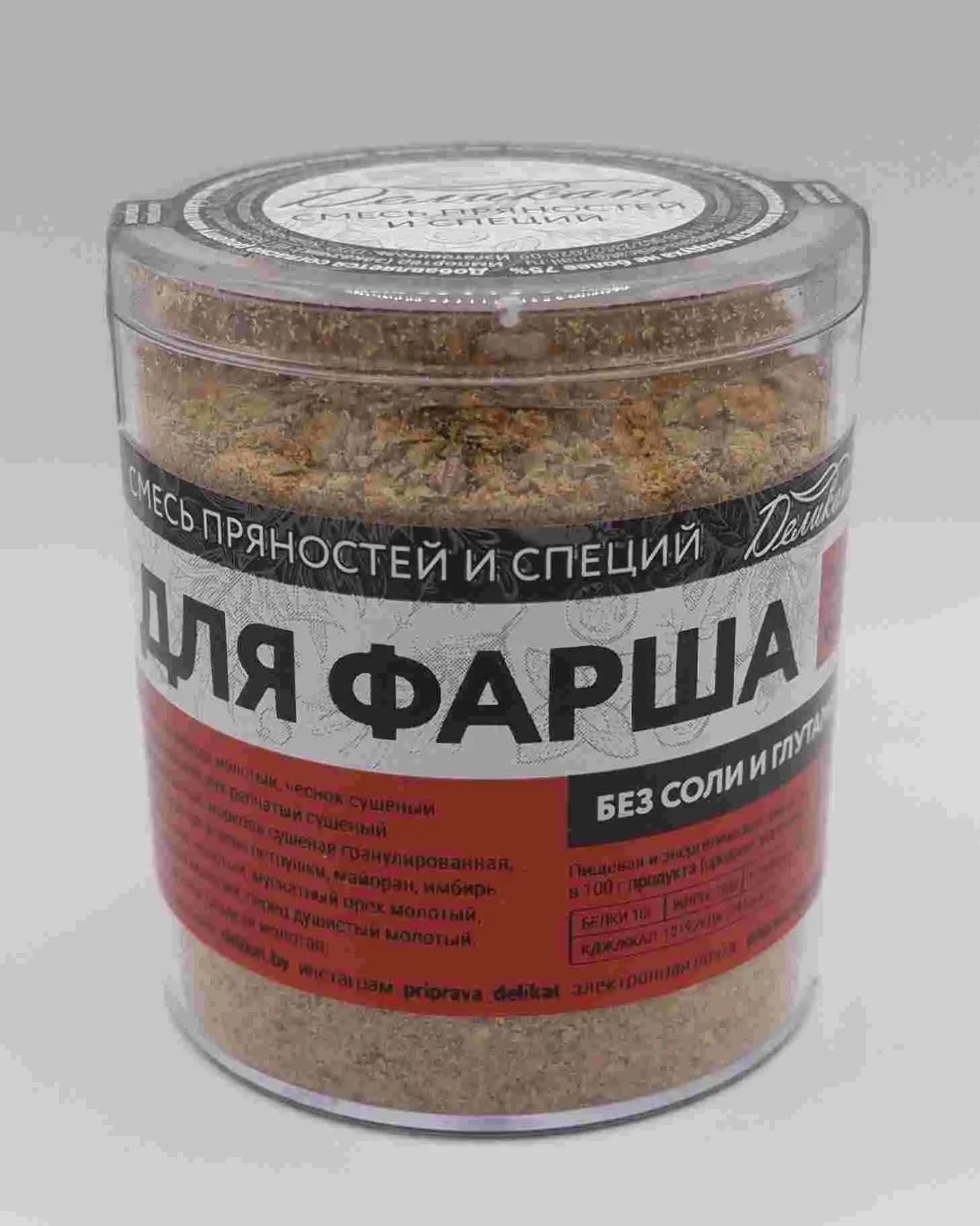 кориандр молотый, чеснок сушеный гранулированный, лук репчатый сушеный гранулированный, морковь сушеная гранулированная, базилик, сушеная зелень петрушки, майоран, имбирь молотый, тмин молотый, мускатный орех молотый, перец черный молотый, перец душистый молотый, паприка красная сладкая молотая.