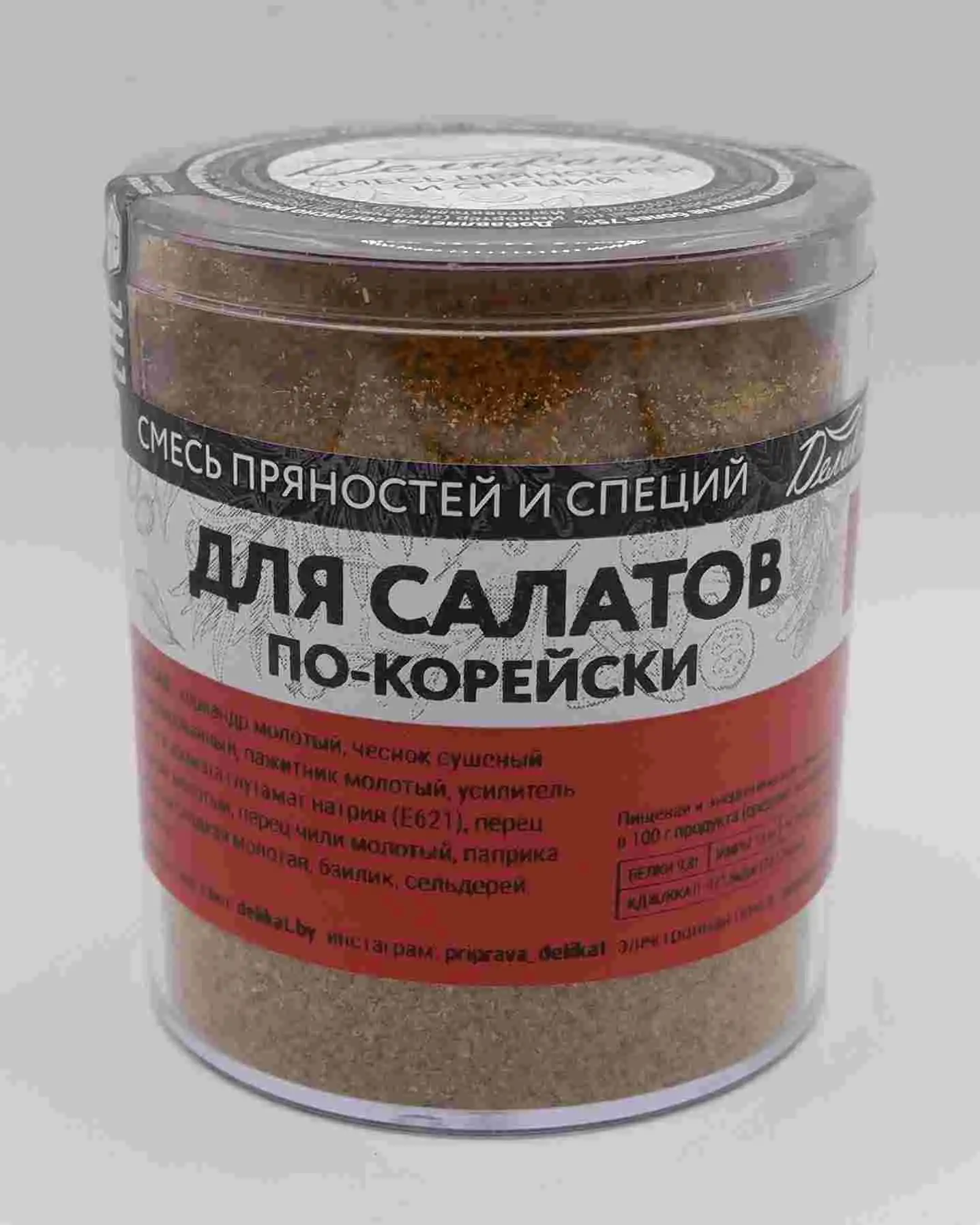кориандр молотый, чеснок сушеный гранулированный, пажитник молотый, усилитель вкуса и аромата глутамат натрия (Е621), перец черный молотый, перец чили молотый, паприка зеленая сладкая молотая, бзилик, сельдерей, куркума.