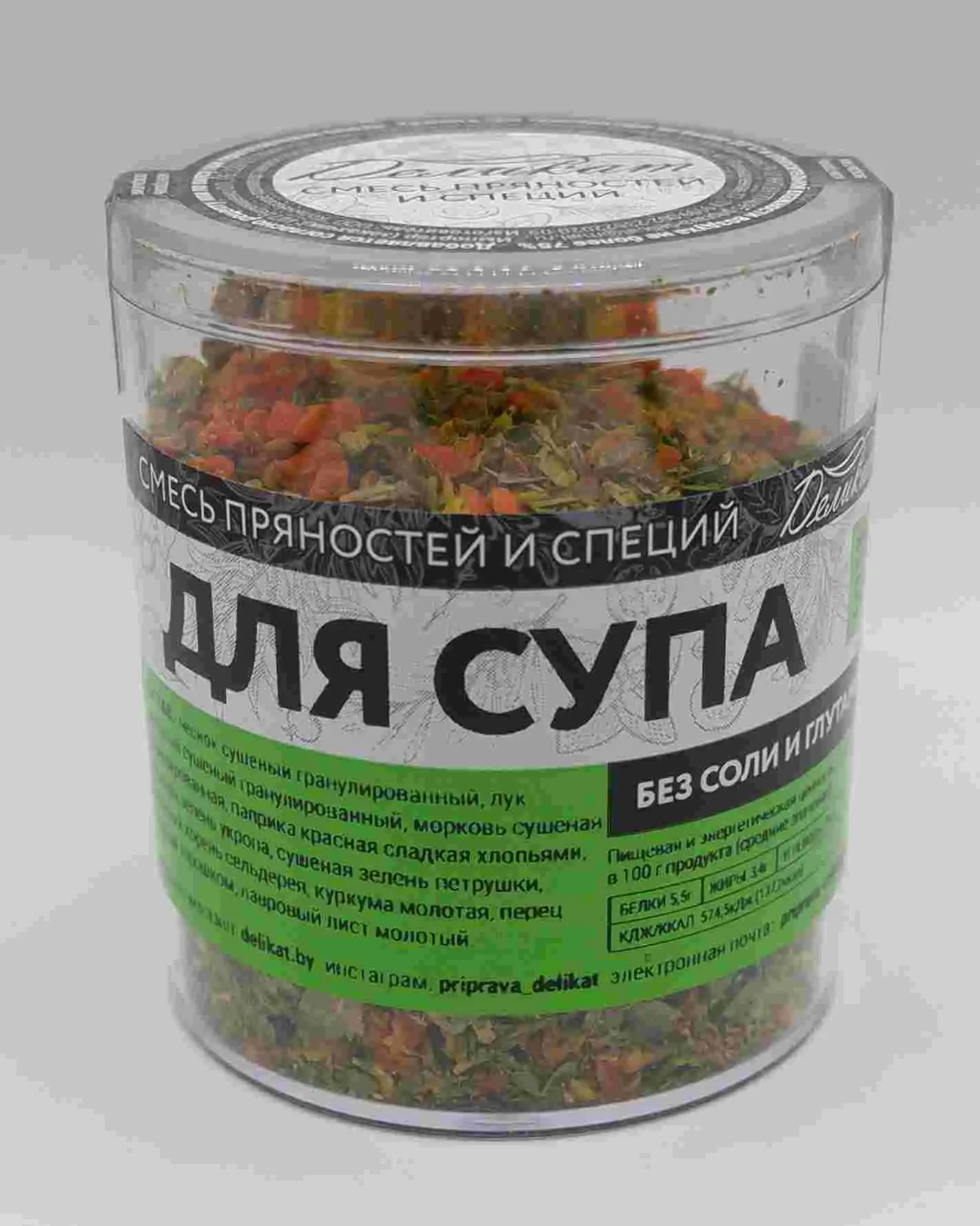чеснок сушеный гранулированный, лук репчатый сушеный гранулированный, морковь сушеная гранулированная, паприка красная сладкая хлопьями, сушеная зелень укропа, сушеная зелень петрушки, сушеный корень сельдерея, куркума молотая, перец черный горошком, лавровый лист молотый.