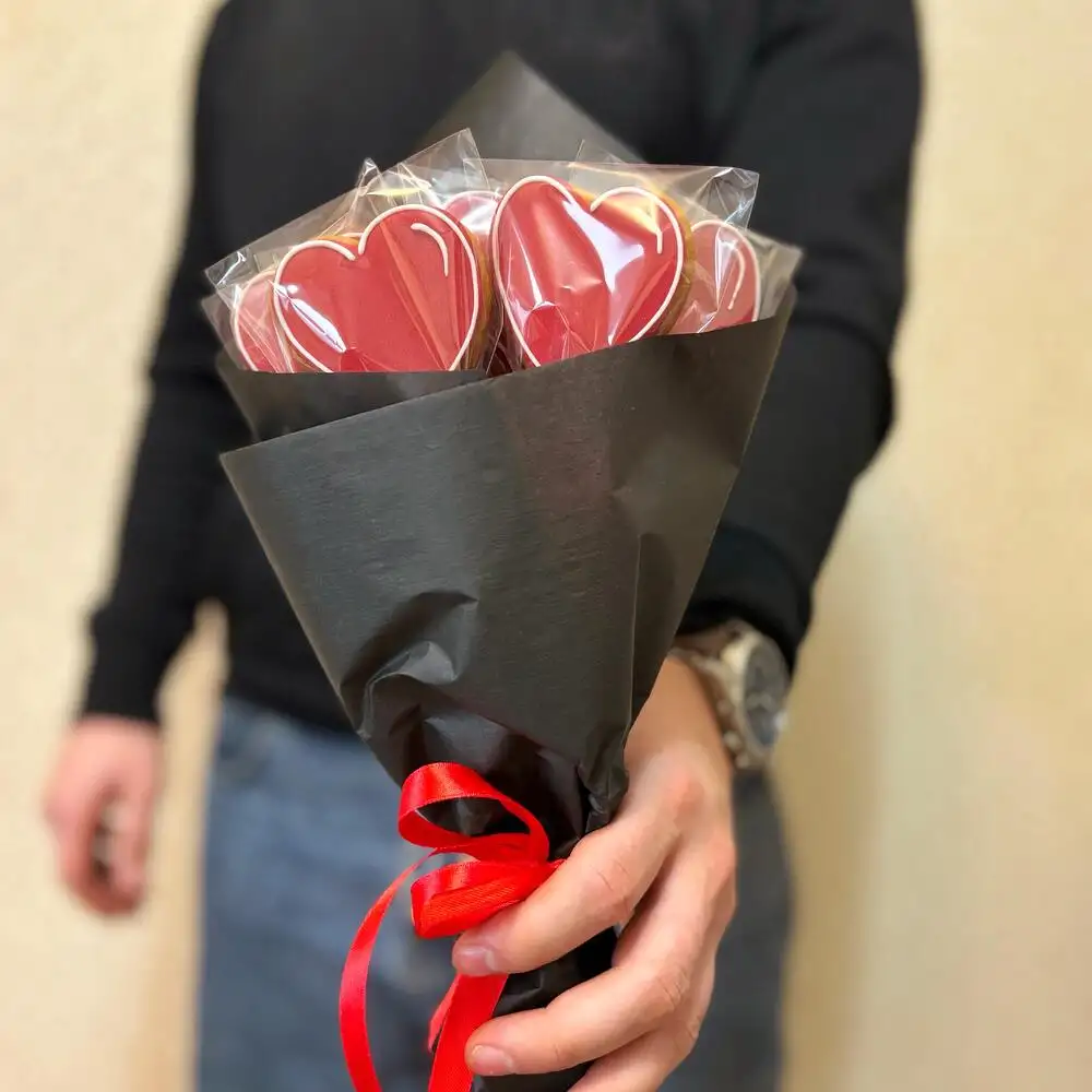Состав Сахар Яйца Сливочное масло 82,5% Мука экстра сорт Соль поваренная Сода пищевая Корица молотая Имбирь молотый Кардамон молотый Пищевой краситель Букет из 7 пряников-сердечек расскажет о вашей любви. В меру сладкие, мягкие, с приятным ароматом специй прянички оставят свой вкус в Вашем сердце. Подарите любимым сладкую любовь. Пряники не содержат мёд. Срок годности 3 месяца.
