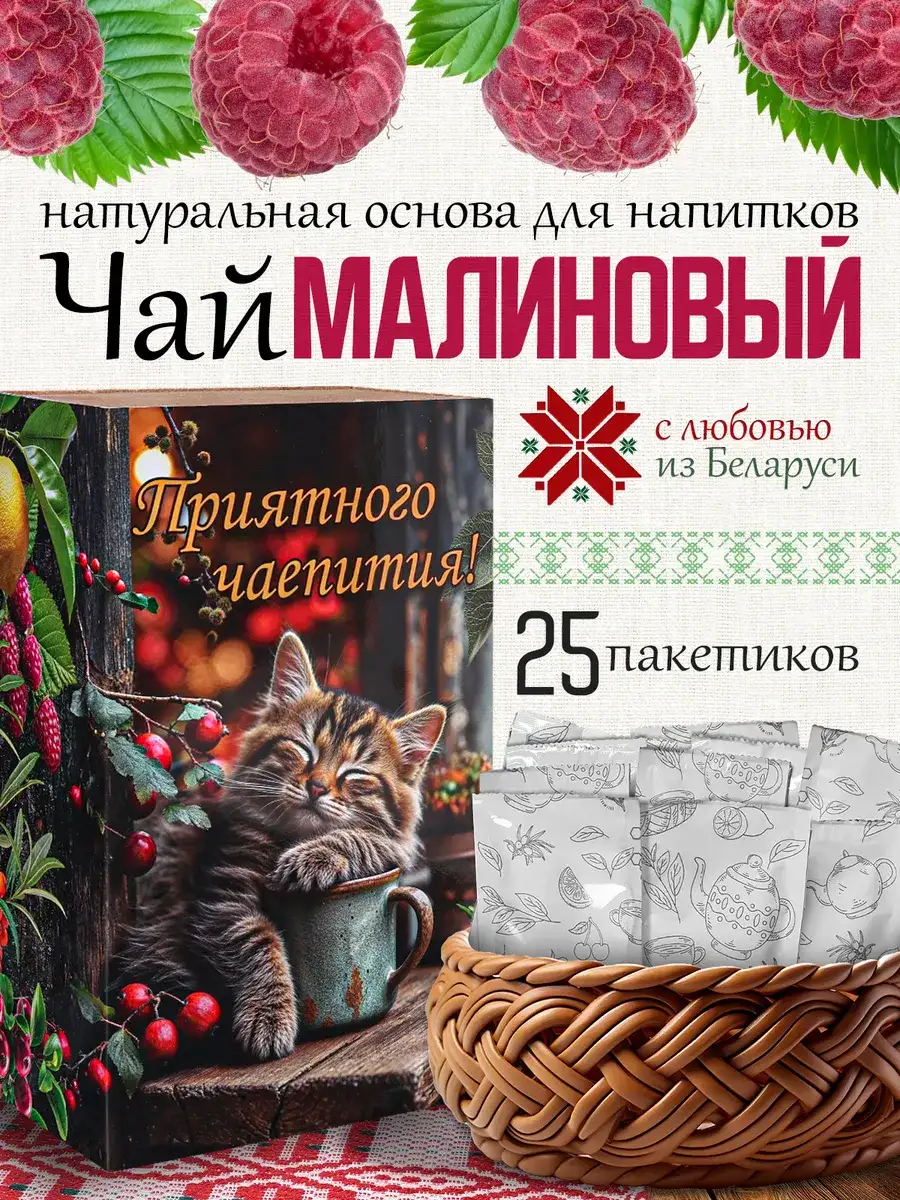 Основы для напитков и чая в порционных пакетиках от белорусского производителя TeaWay — это натуральное ничем не разбавленное ягодное пюре, в котором, благодаря особой обработке, сохранены все питательные вещества и витамины. Малиновый напиток с медом и розмарином — настоящий эликсир здоровья. Малина укрепляет иммунитет, а мёд добавляет напитку антибактериальные свойства. Розмарин придает изысканный вкус и помогает улучшить память. Экстракт чая усиливает все полезные свойства напитка. Он содержит полифенолы, которые защищают сердце и сосуды, улучшают обмен веществ. Натуральный ягодно-фруктовый чай прекрасно утоляет жажду летом, согревает и наполняет витаминами в осенне-зимние холода, а также дополняет различные сладкие напитки и блюда. Преимущества TeaWay: + Натуральные ингредиенты — без искусственных добавок и ароматизаторов, ничем не разбавлены; + Удобный порционный формат — легко хранить и готовить дома, в кафе или ресторане; + Быстрое приготовление — просто добавьте воду и наслаждайтесь вкусом; + Функциональность — подходит для горячих и холодных напитков, йогурта, морса, коктейля, лимонада и даже мороженого. Как использовать? Можно просто разбавить в кипятке для уютного чаепития. А можно добавить в газированную воду со льдом для освежающего напитка в жаркий летний день. Или использовать как топпинг для мороженого, выпечки или десертов. Смешайте с йогуртом и свежими фруктами для вкусного смузи. А если смешать его с молоком и добавить шарик мороженого — то коктейль станет настоящим лакомством для детей и взрослых. Для более насыщенного вкуса можно добавить ягоды. Яркая трогательная упаковка делает наш набор прекрасным подарком для любого праздника или повода. Это милый заботливый подарок для родных: мамы или папы, бабушки или дедушки на день рождения, Новый год. Вручите его на 23 февраля, 8 марта или в день Святого Валентина 14 февраля. На Масленицу или Пасху. Это отличный презент для учителя, воспитателя или семейного доктора. В любом торжестве наш натуральный набор будет кстати. Это отличный выбор для тех, кто ценит качество, натуральность и уникальный вкус. Приготовленный с любовью и заботой, этот концентрат не только утоляет жажду, но и приносит истинное удовольствие от каждого глотка. Приготовление: просто добавьте содержимое пакетика в 250 мл холодной питьевой воды или кипятка, дайте настояться 2 минуты, и освежающий летний напиток или согревающий чай, или компонент для других шедевров готовы! В коробке 25 пакетиков ягодного пюре по 40 г. Срок хранения 9 месяцев при температуре от 0°С до 25°С (не требует холодильника). С заботой сделано в Беларуси.