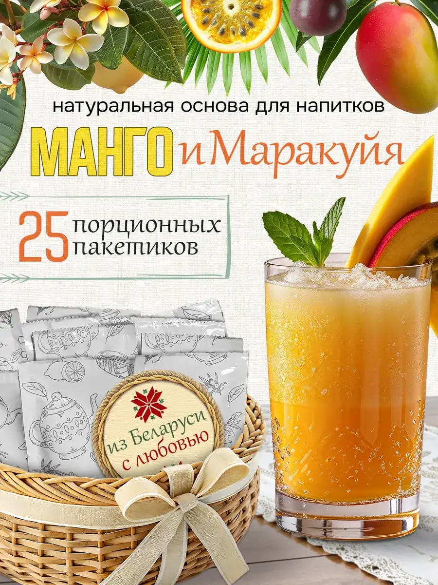 Основы для напитков и чая в порционных пакетиках от белорусского производителя TeaWay — это натуральное ничем не разбавленное фруктовое пюре, в котором, благодаря особой обработке, сохранены все питательные вещества и витамины. Напиток с манго, маракуйей, лимоном и мёдом обладает множеством полезных свойств. Этот концентрат идеально подходит как для приготовления прохладного лимонада в летний зной, так и для теплого чаепития в холодные осенние и зимние вечера. Преимущества TeaWay: + Натуральные ингредиенты — без искусственных добавок и ароматизаторов, ничем не разбавлены; + Удобный порционный формат — легко хранить и готовить дома, в кафе или ресторане; + Быстрое приготовление — просто добавьте воду и наслаждайтесь вкусом; + Функциональность — подходит для горячих и холодных напитков, йогурта, морса, коктейля, лимонада и даже мороженого. Манго богат витаминами С, А и Е, поддерживает иммунитет, здоровье кожи и зрения. Также он содержит антиоксиданты, которые помогают бороться со свободными радикалами. Маракуйя улучшает работу иммунной системы, оказывает успокаивающее действие и помогает в борьбе со стрессом. Её также используют в лечебных целях для улучшения пищеварения. Фруктовые манговые нотки и аромат маракуйи обладают освежающим и бодрящим эффектом, который помогает поднять настроение. Лимон богат витамином C, который помогает укреплять иммунную систему и защищать организм от инфекций. Мёд обладает успокаивающими свойствами и может помочь расслабиться и улучшить качество сна. Как использовать? Можно просто разбавить в кипятке для уютного чаепития. А можно добавить в газированную воду со льдом для освежающего напитка в жаркий летний день. Или использовать как топпинг для мороженого, выпечки или десертов. Смешайте с йогуртом и свежими фруктами для вкусного смузи. А если смешать его с молоком и добавить шарик мороженого — то коктейль станет настоящим лакомством для детей и взрослых. Для более насыщенного вкуса можно добавить ягоды. Добавьте его в свои рецепты и насладитесь яркими и незабываемыми вкусовыми ощущениями. Это отличный выбор для тех, кто ценит качество, натуральность и уникальный вкус. Приготовленный с любовью и заботой, этот концентрат не только утоляет жажду, но и приносит истинное удовольствие от каждого глотка. Приготовление: добавьте содержимое пакетика в 250 мл холодной питьевой воды или кипятка, дайте настояться 2 минуты, и освежающий летний напиток или согревающий чай готовы! В коробке 25 пакетиков фруктового пюре по 40 г. Срок хранения 9 месяцев при температуре от 0°С до 25°С (не требует холодильника). С заботой сделано в Беларуси.