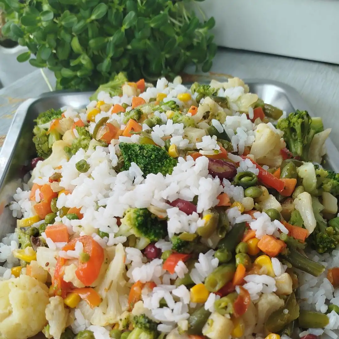 Рассыпчатый рис в сочетании с яркой смесью сезонных овощей, сохраняющих свою текстуру и легкую сладость.