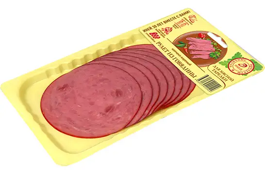 Состав: говядина, мясо кур, вода питьевая, белок животный говяжий, крахмал картофельный, нитритно-посолочная смесь (соль, фиксатор окраски (нитрит натрия)), загуститель (каррагинан), регулятор кислотности (трифосфаты), усилитель вкуса и аромата (глутамат натрия), виноградный сахар, антиокислитель (аскорбат натрия), ароматизатор, краситель (кармины).