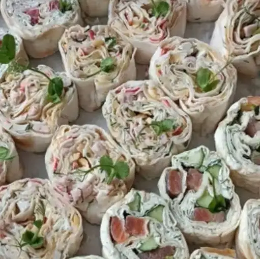 Рулет с форелью — форель, огурец свежий, салат листовой, творожный сыр. Рулет с ветчиной — ветчина, перец свежий, салат листовой, творожный сыр.