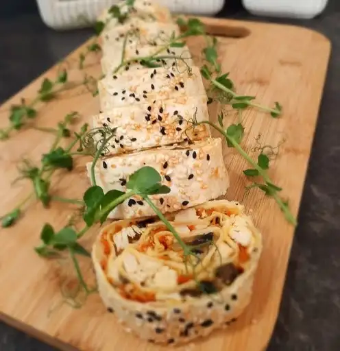 На выбор: Состав 1: лаваш, форель, листья салата, огурец, творожный сыр Состав 2: лаваш, филе куриное, морковь, шампиньоны, лук, сыр