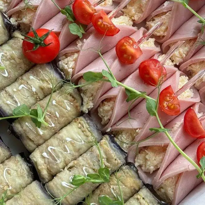 из ветчины, 12 шт. — 25,00 руб. из баклажан, 12 шт.- 25,00 руб.
