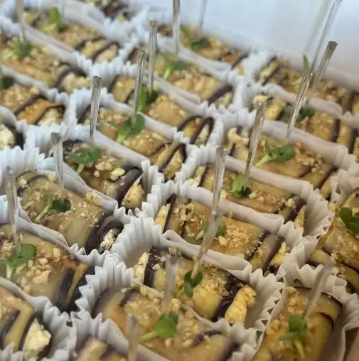 На выбор: — Рулетики из баклажан с сырно-чесночной начинкой с орехами — Рулетики из баклажан с сырно-чесночной начинкой с черри Заказ от 10 штучек.