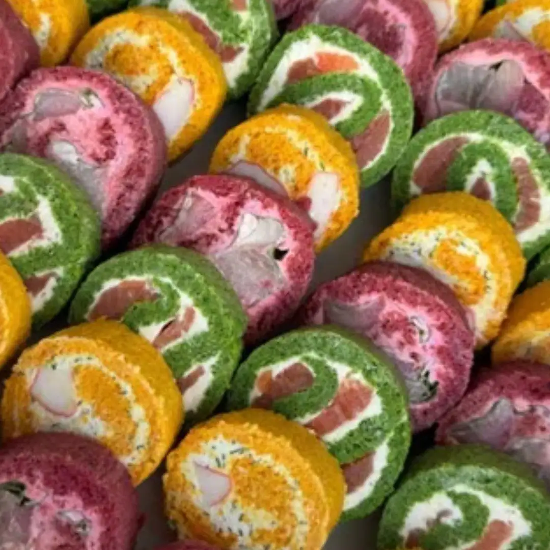 1. Шпинатный рулет 15−16 кусочков — 50 руб. 2. Свекольный рулет 15−16 кусочков — 45 руб. 3. Морковный рулет 15−16 кусочков — 40 руб.